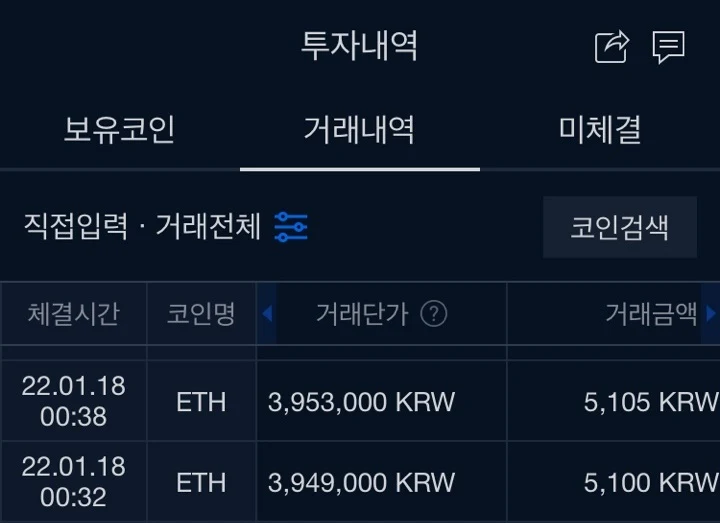 2022년 1월 18일 00시 38분 거래 => 매도 => 수량 : 0.00129145, 단가 3,953,000, 거래금액 5,105krw, 수수료 2.55krw, 정산금액 5,102krw