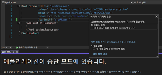 애플리케이션이 중단 모드에 있습니다. 리소스가 없습니다. 오류가 발생하는 경우가 있습니다. 이번 예제는 스타트업 경로를 달리 할 때 발생하는 예제를 보여드리겠습니다. 추가적으로 WPF에서 StartupUri를 다른 폴더로 설정하는 방법에 대해 알아보도록 하겠습니다.